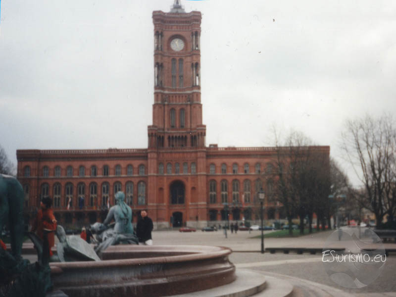 Enseguida topamos, en Rathausstrasse, con el Berliner Rotes Rathaus. Se construyó entre los años 1861 y 1869 inspirado en el estilo del Renacimiento italiano, obra de Hermann F. Waesemann. Su característica principal es la torre de 74 metros de altura cuya arquitectura está inspirada en las torres de la Catedral de Laon en Francia y en su cierto aire de fortaleza compuesta de 4 cuerpos que se agrupan alrededor de tres patios. El hecho de que este edificio ocupe una manzana entera es debido a que sustituyó a otras edificaciones de la Edad Media. A lo largo de su fachada podemos ver 36 placas de terracota que narran la historia de Berlín hasta el año 1871.