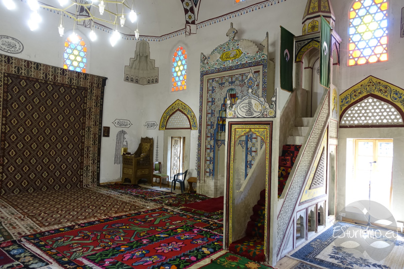 Hay que señalar que la mezquita y el complejo fueron totalmente destruidos en 1993 en el transcurso de un asedio a la ciudad por parte de las tropas croatas de HVO. Tras terminar la guerra fue objeto de reconstrucción entre los años 1999 a 2001. Tras este apunte y tras adquirir los tickets nos disponemos a acceder al interior de la mezquita. Los muros, que cuentan con 25 ventanas de diferentes tamaños, están decorados con motivos vegetales, del mismo modo que los de la mezquita Karađoz Beg. A la izquierda, ocupando parte de la pared y del suelo, podemos ver la alfombra que regaló el monarca austríaco Franjo Josip a esta mezquita.