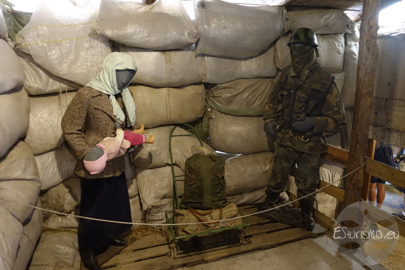 Más imponente es, sin embargo, una réplica de una sección transversal del túnel en el que vemos una recreación de uno de sus usos, así como los elementos originales que conformaban el túnel. De hecho, aquí vemos, en el techo, la estructura de hierro original que se usó a lo largo de la construcción del túnel desde la zona en la que nos encontramos y en dirección a Dobrinja, mientras que, en el lado contrario, en la sección que va en dirección a Butmir, se utilizó madera como material de construcción; esto es debido a que en el Sarajevo sitiado había escasez de madera ya que se utilizó para cocinar y generar calor. En el suelo podemos ver una pequeña vía de ferrocarril por el que circulaban vagones para el transporte de mercancías y materiales. En las paredes vemos los cables de electricidad (la cual se distribuía a consumidores prioritarios), los tubos para el transporte de combustible, los cables de telecomunicaciones, etc.…