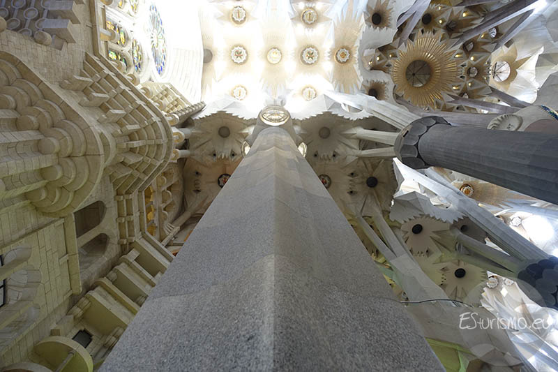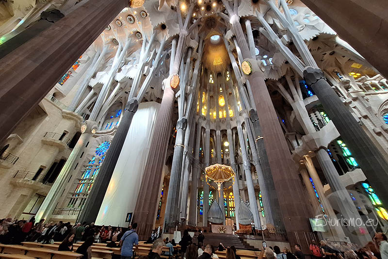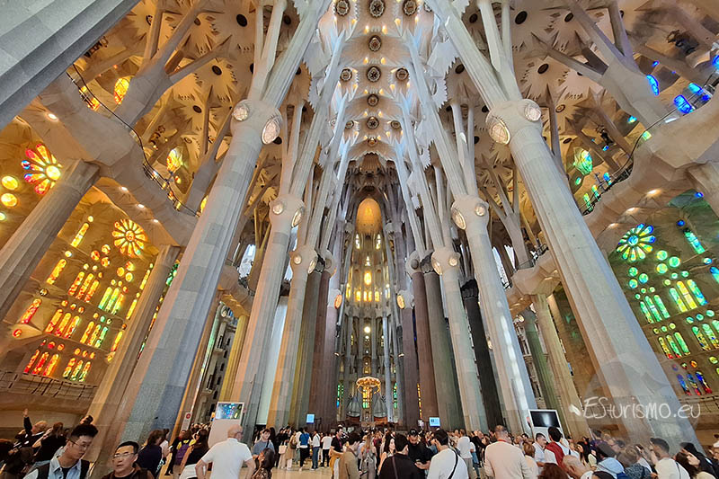 Volvemos de nuevo a la fachada del Nacimiento para atravesar la portada y accedemos al interior de la Sagrada Familia, cuya primera impresión es color, amplitud y mucha vida. Podemos apreciar que tiene una distribución en forma de cruz latina, con el ábside situado en la cabecera, y dividida en cinco naves (una central y dos laterales a cada lado), mientras que el transepto cuenta con una nave central y otra lateral en cada extremo. Por su parte, las bóvedas van incrementando su altura desde las entradas de las fachadas del Nacimiento, la Pasión y la Gloria hasta llegar a la zona del ábside.