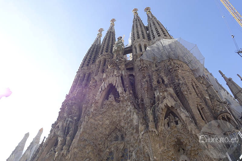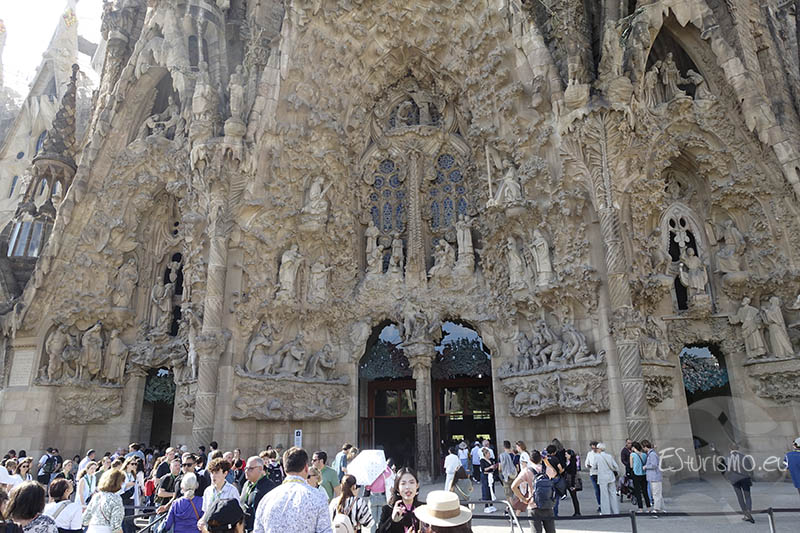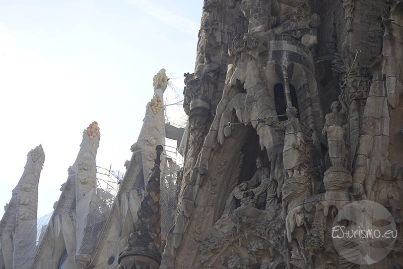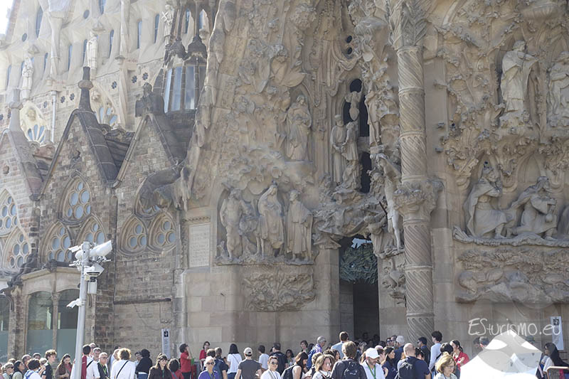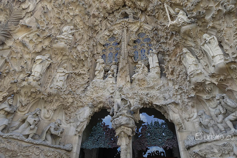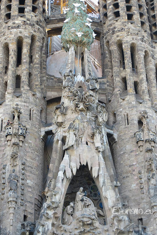 Al colocarse frente a la fachada del Nacimiento de Jesús la primera percepción que se siente es una especie de montaña llena de vida. Y es que Gaudí quiso que transmitiera vida, alegría y celebración, por lo que la concibió como una exaltación de la creación divina y de la vida en todas sus formas, en contraposición con la dureza y el sufrimiento que protagonizan la fachada de la Pasión. Por eso la fachada está llena de representaciones de animales, como conchas, aves, gallinas, patos, águilas, y de numerosos elementos vegetales como rosas, almendros, cerezos o lirios, que simbolizan la vida y celebran el nacimiento de Jesús. Para lograr una gran fidelidad en las figuras, Gaudí trabajaba a partir de modelos reales, tanto de personas como de animales. Tras elaborar las maquetas en yeso, las colocaba directamente en la fachada para comprobar su efecto, y solo cuando quedaba satisfecho se procedía a tallarlas en piedra.