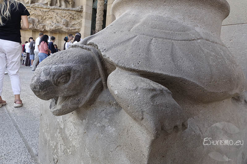 Estas columnas reposan sobre tortugas: la situada a la izquierda, junto al portal de la Esperanza dedicado a José, es una tortuga marina; la columna que divide los portales de la Caridad y la Fe descansa sobre una tortuga terrestre y lleva el nombre de María, protagonista de esta última portada. La tortuga terrestre simboliza lo estable, lo firme, mientras que la marina, lo cambiante. Juntas representan el equilibrio de la creación y el paso lento pero constante del tiempo, o lo que es lo mismo es un símbolo de la gran obra de Dios que avanza despacio, pero que avanza siempre.