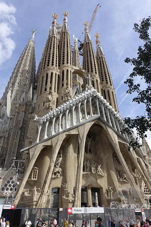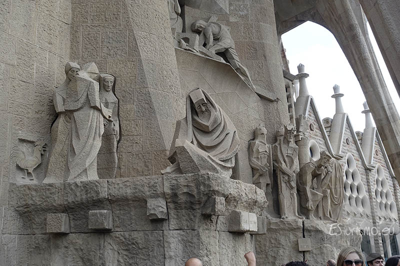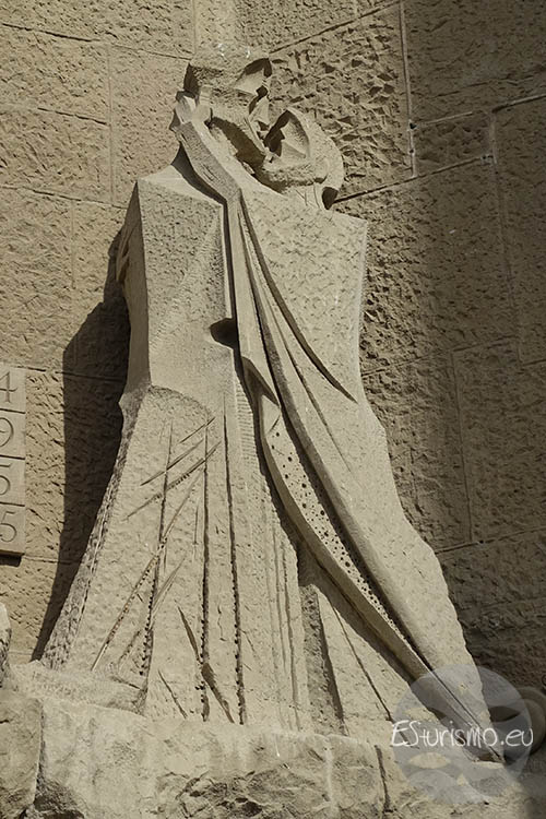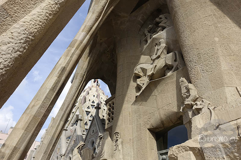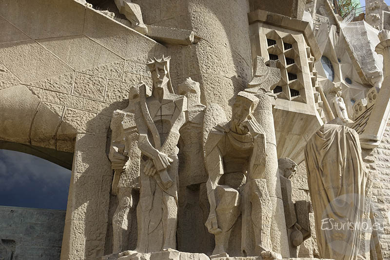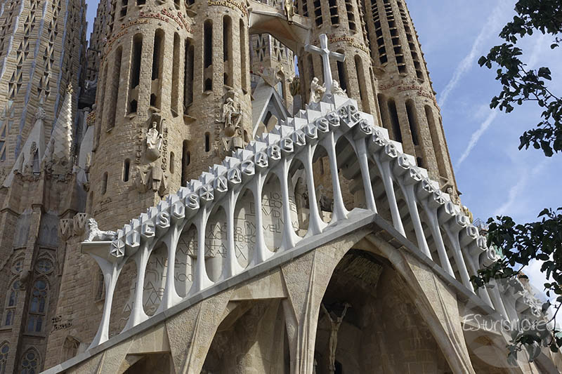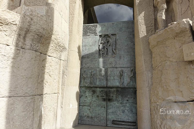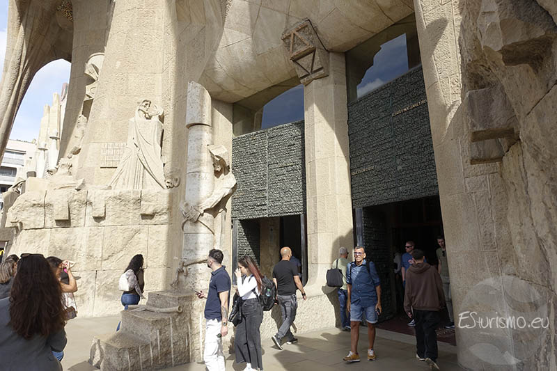 Lo primero que vamos a destacar, antes de centrarnos en la fachada en sí, son los accesos que conducen al interior de la Basílica desde esta zona del templo, los cuales cuentan con puertas de bronce de dos hojas, también realizadas por Subirachs. En el portal central se encuentran dos puertas que incorporan alrededor de diez mil letras en relieve que reproducen distintos pasajes del relato de la Pasión. En la puerta izquierda se incluyen fragmentos del Evangelio de Mateo, mientras que en la derecha aparecen textos del Evangelio de Juan. Algunas letras y palabras del bronce han sido pulidas de manera intencionada para resaltar expresiones de especial relevancia, como el nombre de Jesús o la célebre pregunta de Poncio Pilato: “¿Qué es la verdad?”.