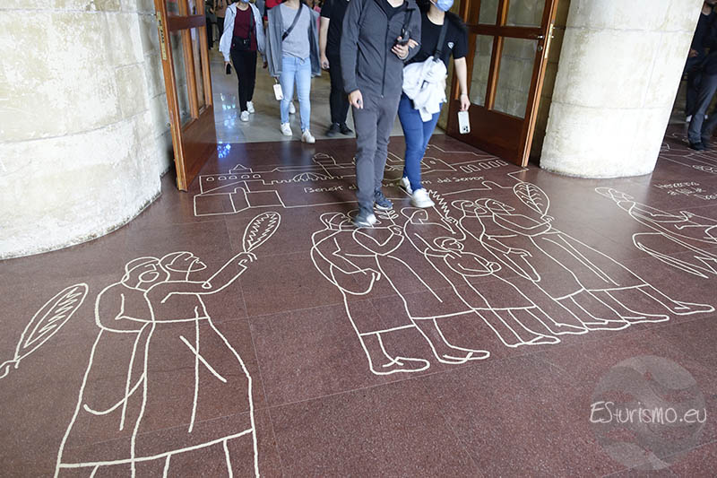 Tras atravesar cualquiera de ellas, entramos en el cancel del portal, en cuyo suelo se encuentra una obra de Domènec Fita que hace referencia a la celebración del Domingo de Ramos. De nuevo en el exterior del edificio, además de las puertas de acceso, en el interior del gran pórtico podemos ver una sucesión de esculturas que narra la Pasión de Cristo. Para seguir el hilo argumental se debe comenzar desde la parte inferior izquierda e ir dibujando una especie de S imaginaria que terminaría en la escultura de la Ascensión de Jesús, situada en lo más alto. Se comienza, pues, con el grupo escultórico de la Última Cena, en la que Jesús comparte la mesa con sus discípulos en el momento en que establece el sacramento de la Eucaristía.