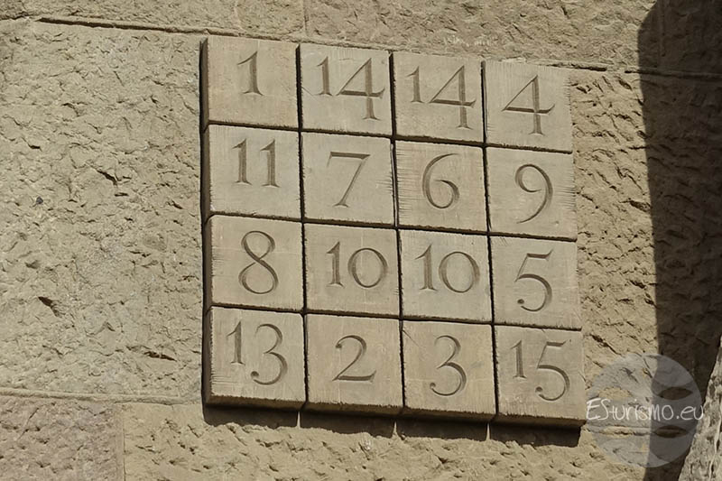 Es junto a esta escena donde vemos un detalle curioso que muchos visitantes pasan desapercibido: un cuadrado lleno de números tallados en la piedra. A primera vista puede parecer sólo una curiosidad matemática, pero en realidad es un elemento pensado con un significado profundo. Se trata de un cuadrado mágico, es decir una cuadrícula en la que, sin importar cómo se sumen los números (ya sea por filas, columnas o diagonales), el total es siempre el mismo. Normalmente, en un cuadrado de 4×4 bien hecho se utilizan los números del 1 al 16 sin repetir y la suma constante es 34. Pero el que vemos aquí no sigue exactamente esas reglas clásicas: faltan los números 12 y 16, y algunas cifras como el 10 y el 14 aparecen más de una vez. Aun así, todas las filas, columnas y diagonales suman 33, cifra que para la tradición cristiana representa la edad de Jesús en el momento de su crucifixión.