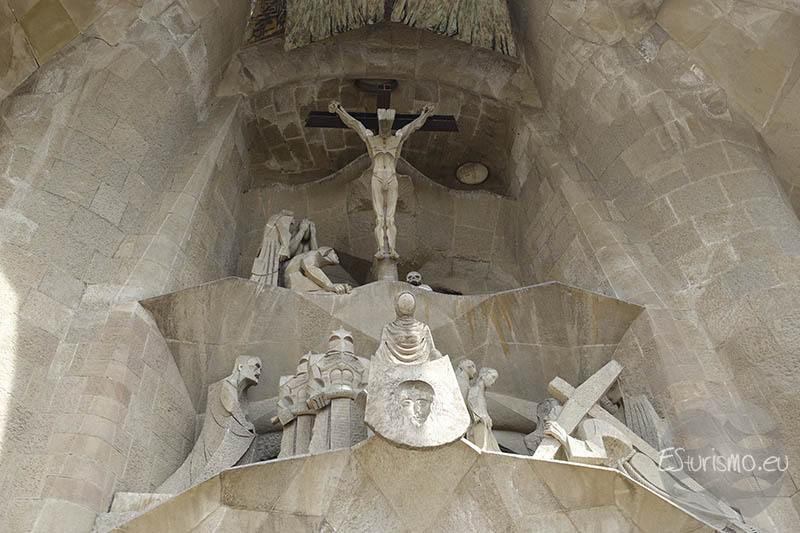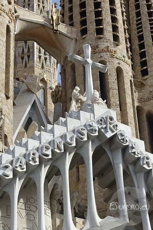 Más arriba, en el centro del frontón, se alza una cruz de 7,5 metros de altura, 4,25 metros de anchura y un peso aproximado de 18 toneladas, símbolo del triunfo sobre la muerte. A sus pies se sitúan tres ángeles esculpidos en travertino italiano por Lau Feliu, conformando un conjunto que, por su composición formal, intensifica la sensación de ascenso de la fachada hacia la cruz. Por encima del nártex, en la parte más elevada del gran ventanal central de la fachada, se sitúa la representación del Espíritu Santo, simbolizado mediante una paloma. Como culminación del conjunto, en el puente que conecta los dos campanarios centrales se puede observar la escultura de la Ascensión de Jesús, realizada en bronce dorado también por Subirachs.