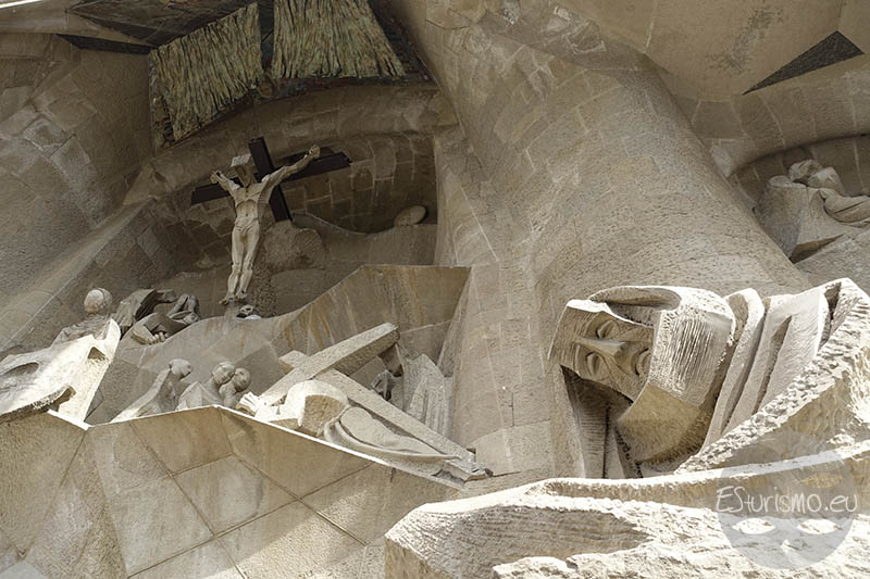 En la escena, Jesús aparece en la cruz, rodeado por varias figuras: María Magdalena arrodillada, María de Cleofás y la Virgen María, cuyo rostro cubre mientras san Juan la sostiene y la consuela. En la base de la cruz, una calavera representa la muerte y hace alusión al lugar de la crucifixión, conocido como Gólgota que significa “cráneo” en arameo. Encima de la escena de la crucifixión, Subirachs colocó placas de bronce que evocan el velo del templo que, según los Evangelios, se rasgó al morir Jesús, creando un efecto similar al de un baldaquino que protege y enmarca la composición.