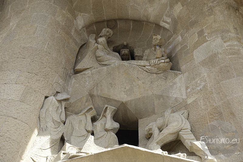 Se sigue por la zona superior (y ahora en dirección a nuestra izquierda), en la que se encuentra la escena de la caída de Jesús ante las Tres Marías (la Virgen María, María de Cleofás y María Magdalena) de camino al monte del Calvario, mientras Simón de Cirene le ayuda a cargar la cruz. Seguimos el hilo argumental y ahora, situado en el nivel intermedio de la fachada, encima de las puertas principales, se encuentra el grupo escultórico de Jesús que consuela a las mujeres de Jerusalén durante su segunda caída en el Viacrucis. Entre ellas, Verónica destaca al limpiar el rostro de Jesús con un paño, dejando impresa su imagen. Tallada en bajorrelieve, la figura de Jesús da la sensación de mirar al espectador desde cualquier ángulo en el que se encuentre. Es en este grupo escultórico donde Subirachs rinde un doble homenaje a Antoni Gaudí: por un lado, el evangelista ubicado a la izquierda, cuya particularidad es que tiene el rostro de Gaudí durante la procesión del Corpus Christi en Barcelona; por otro, los cascos de los soldados cuya forma recuerda a las chimeneas de la Casa Milà o Pedrera.