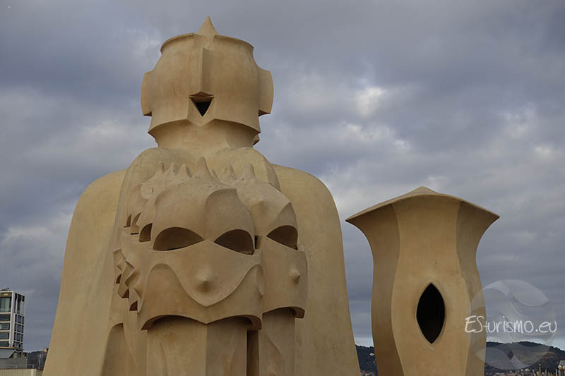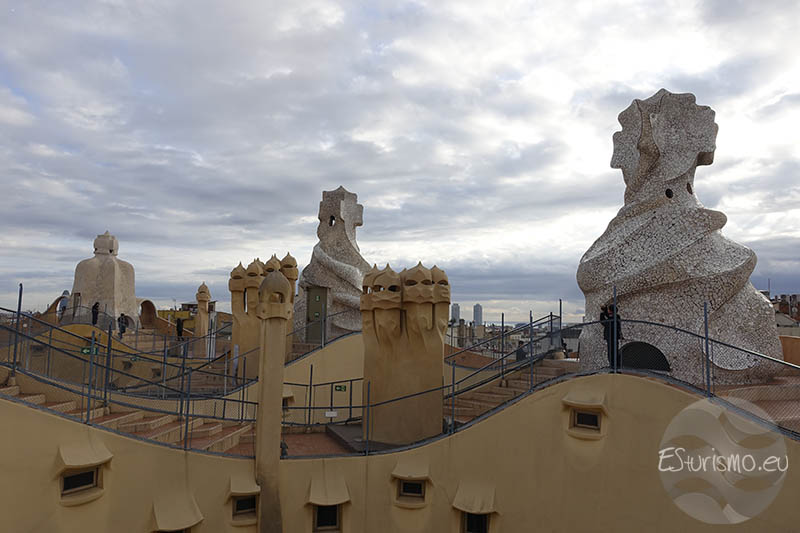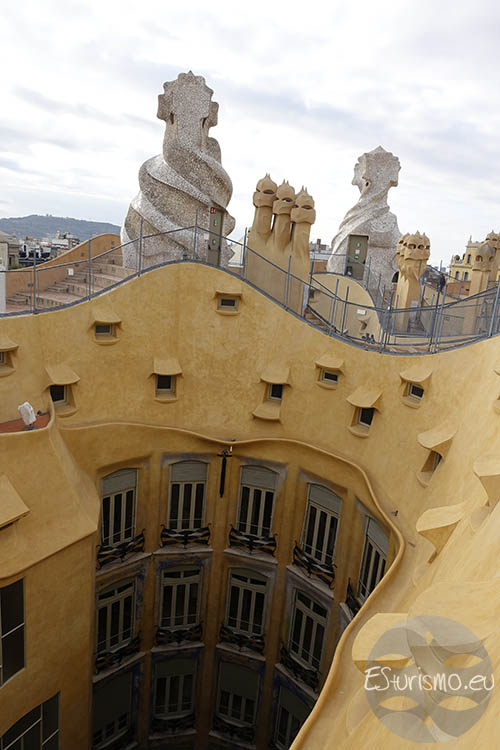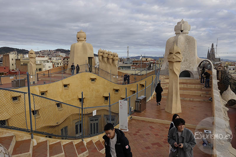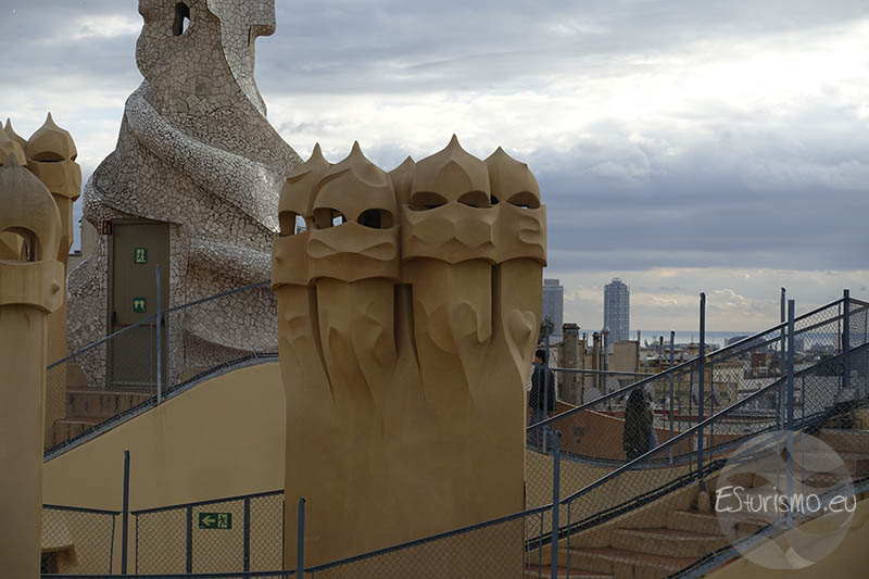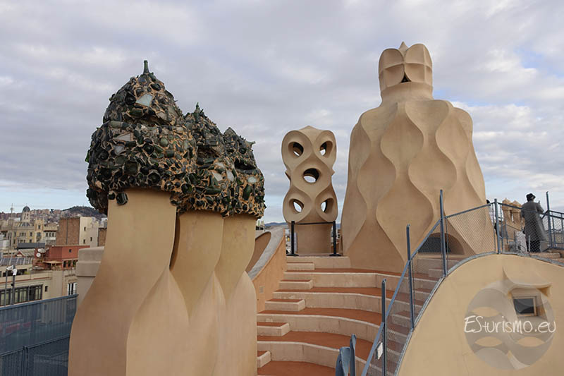 Otros de los elementos que llaman poderosamente la atención en la azotea de La Pedrera son las veintinueve chimeneas que se distribuyen por todo el espacio, convirtiéndolo en un paisaje escultórico único. Estas estructuras servían antiguamente como salidas de humo de la calefacción central de carbón, hoy ya en desuso. Dos de ellas aparecen aisladas, mientras que el resto se organiza en grupos de distintas cantidades, creando un ritmo visual muy característico.