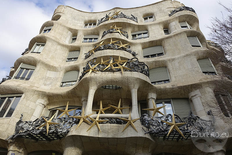 En cuanto a los balcones, no se tratan de elementos convencionales, ya que su gran tamaño, marcado tanto por el saliente de piedra como por la forma cóncava de la fachada, los convierte casi en pequeñas terrazas. Con esta solución, Gaudí rompió con la concepción tradicional del balcón. Además, incorporó una innovación poco habitual para la época: los desagües se colocaron por debajo del nivel del pavimento interior, lo que permitió que desde el interior del piso se tuviera una visión clara de la calle.
