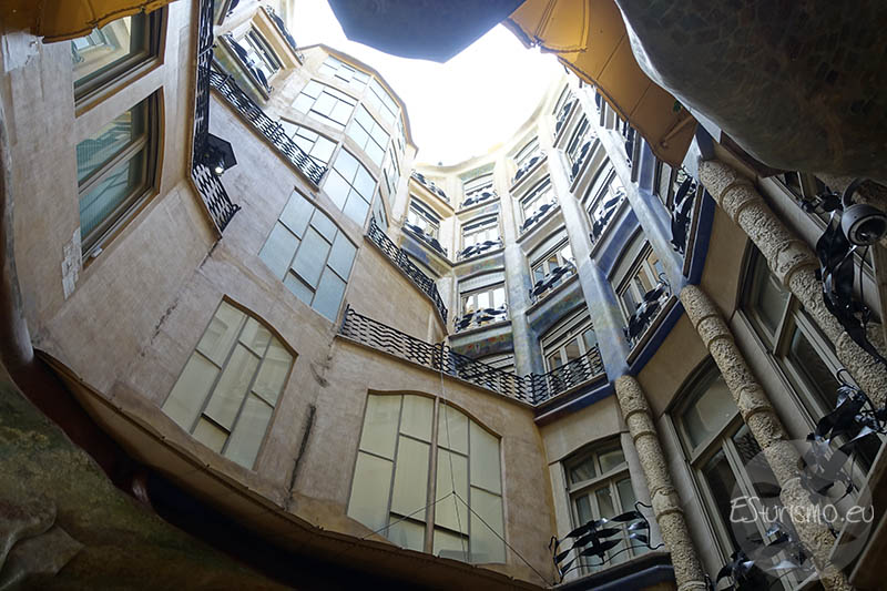 Por otro lado, Gaudí utilizó aquí una gradación cromática, es decir tonos más oscuros en la parte inferior y más claros en los niveles superiores de las fachadas, para mejorar la reflexión de la luz hacia el interior. Además, la visión desde los patios permite apreciar que desde aquí las columnas y los balcones parecen crecer como troncos y ramas. En definitiva, en La Pedrera nada es recto y todo fluye como en la naturaleza, la mayor fuente de inspiración de Gaudí.
