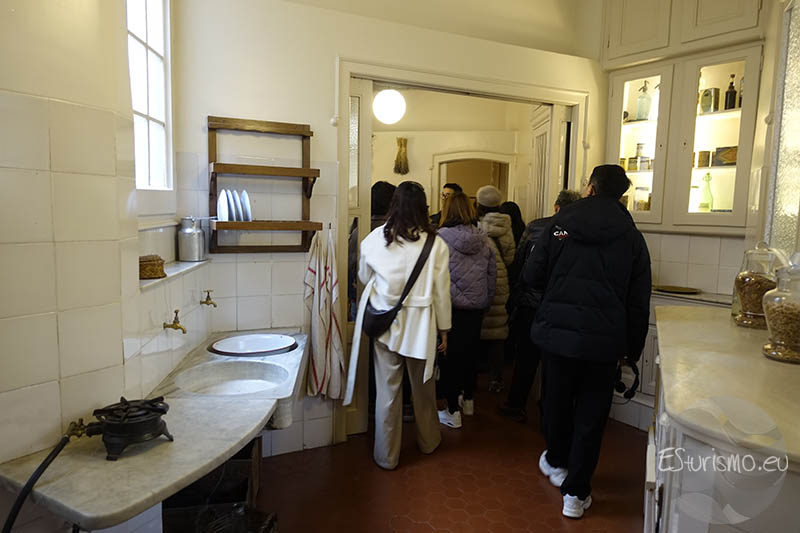 Enseguida llegamos a la cocina, uno de esos espacios donde Gaudí demuestra que su genialidad no era sólo estética, sino también práctica y adelantada a su tiempo. Y es que, a diferencia de los salones nobles, la cocina estaba pensada para el trabajo diario del servicio, así que Gaudí se obsesionó con que fuera cómoda, higiénica y eficiente, nada de adornos innecesarios: aquí manda la lógica. Para ello, gracias al patio interior, la cocina recibe aire fresco constante, algo revolucionario a principios del siglo XX, además los techos son altos para ayudar a disipar el humor y el calor. Por otro lado, los azulejos blancos biselados en las paredes son fáciles de limpiar y muy luminosos, algo que en su momento fue también toda una innovación.