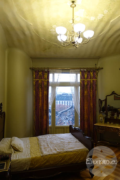 Llegamos ya a la zona de las habitaciones principales (las orientadas a la fachada que da al Passeig de Gràcia), comenzando con uno de los dormitorios que, concebido con vocación funcional y elegancia sobria, se pensó como un espacio de reposo que combinara privacidad, luz y comodidad. Tanto esta estancia como otras dependencias principales (como el salón y el estudio) tienen suelo de parqué y una decoración que mezcla estilos predominantes de finales del XIX y principios del XX, entre el imperial, el isabelino y el catalán modernista. Esta habitación se distingue por una sensación de espacio más generoso de lo que cabría esperar en una gran ciudad como es Barcelona. Si se mira hacia arriba veremos un techo ondulado y decorado con dibujos florales de tonos suaves pintados a mano.