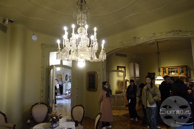 Nos encontramos ya en el comedor principal, un espacio presidido por una gran mesa y mobiliario de madera noble cuidadosamente trabajada, que deja ver la influencia modernista característica de Gaudí. Los sillones y los aparadores se integran con elegancia, creando un ambiente equilibrado y acogedor. Entre los detalles más sugerentes destaca un juego de café de plata, evocación directa del modo de vida y las costumbres de la familia Milà. Todo el conjunto transmite una sensación de sofisticación cálida, donde lo cotidiano adquiere un valor artístico. En el centro del espacio, una lámpara de hierro forjado parece suspendida en el aire, concebida para dialogar con las curvas del techo y reforzar la armonía del conjunto.