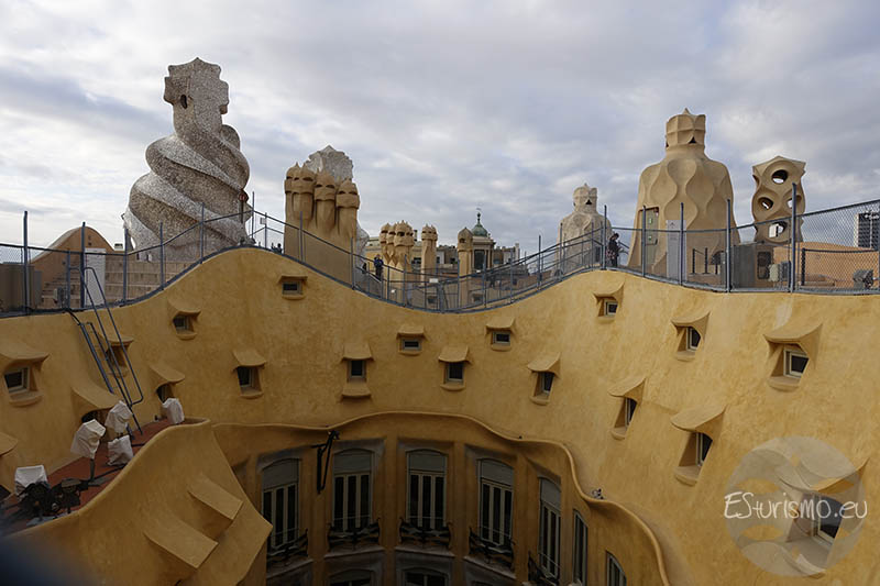 En la cubierta conviven distintas estructuras arquitectónicas que se agrupan en tres grandes tipologías: las cajas de las escaleras o “badalots”, las torres de ventilación y las chimeneas. Las barandillas de piedra que delimitan la azotea ondulan suavemente, adaptándose al movimiento de la fachada, refuerza la sensación de continuidad formal. El resultado es un espacio donde el orden, la belleza y la funcionalidad se equilibran de manera excepcional. Todas aquellas estructuras se alzan como auténticas esculturas, con formas orgánicas, ondulantes y casi irreales, como si emergieran directamente de la piedra, por lo que pasear entre ellas es adentrarse en un escenario fantástico, lleno de curvas y siluetas.