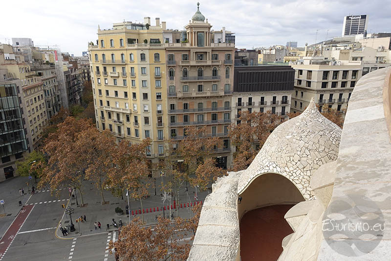 Pero es que desde cualquier punto de la azotea se disfruta de una magnífica vista de Barcelona, con el paseo de Gràcia a un lado y las torres de la ciudad recortándose en el horizonte. La combinación de las vistas y las formas convierte la azotea en un espectáculo donde la arquitectura de Gaudí dialoga con la grandeza urbana de Barcelona. En cuanto a los patios interiores, Gaudí había proyectado una reja perimetral que imitaba las formas ondulantes del edificio, pero el diseño quedó inconcluso. Para evitar riesgos derivados de dejar el espacio abierto, los propietarios optaron por instalar una malla metálica de forma hexagonal que cumple una función protectora.