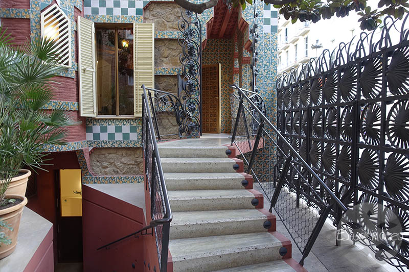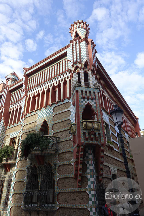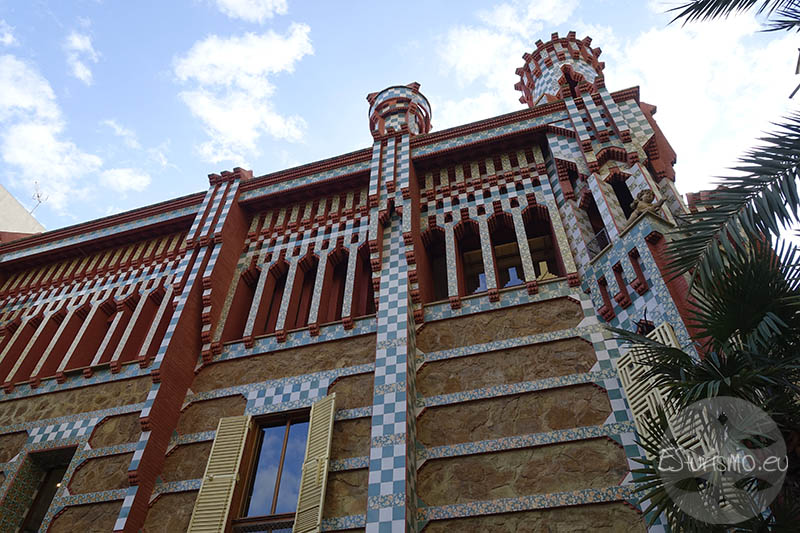 Gaudí rompe con los cánones tradicionales al revestir la fachada con cerámica, un material reservado hasta entonces casi exclusivamente a los interiores, consiguiendo un gran estallido cromático y llena de pequeños detalles. Era la primera vez que lo utilizaba de este modo, aunque no sería la última. Las baldosas reflejan su fascinación por la naturaleza y por las culturas orientales, la carpintería de puertas y ventanas recuerda claramente al estilo japonés, y sobre la tribuna de la fuente aparecen inscripciones en catalán que evocan la caligrafía árabe. Cada texto alude a una orientación solar distinta: el de la fachada principal habla del calor del hogar, el situado a la izquierda, del sol matinal y el de la derecha, ubicado en la zona más fresca de la casa, hace referencia a la agradable sombra estival.