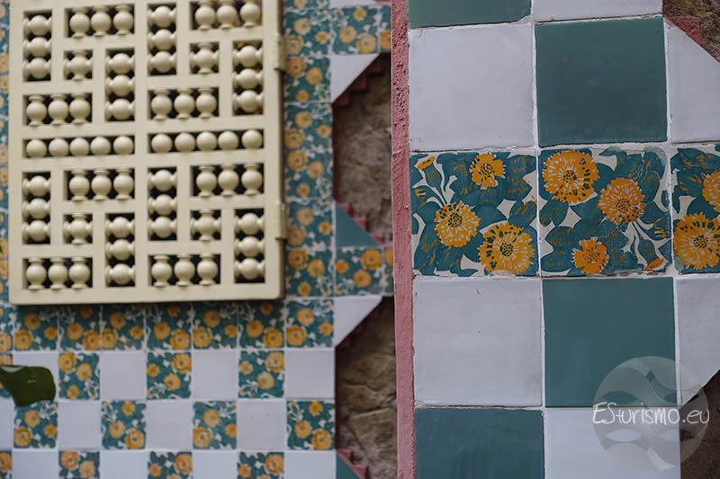 Si se observa con atención los azulejos florales que rodean esta franja, se podrá apreciar que algunos están colocados en capicúa y otros no. Los primeros forman parte de la construcción original de Gaudí, mientras que los segundos corresponden a la ampliación de Serra de Martínez. Se trata, pues, de un detalle sutil y elegante para diferenciar ambas etapas.