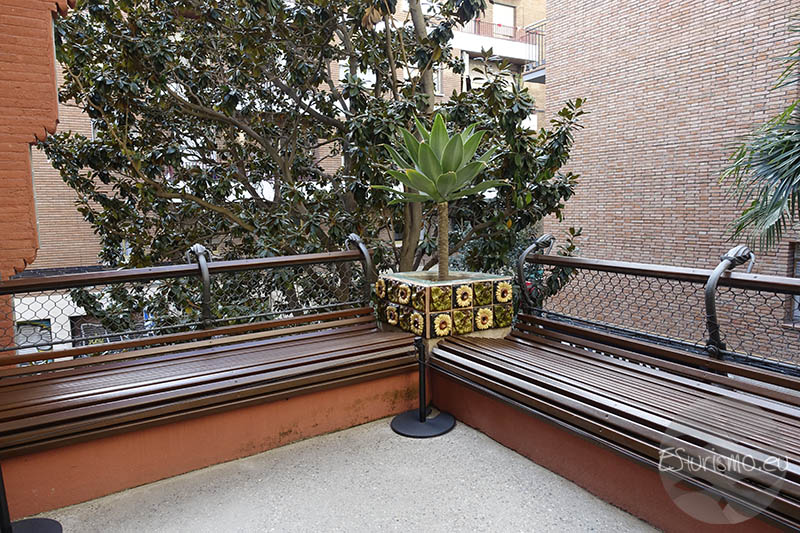 El techo, como ya vimos en muchas otras habitaciones de la primera y segunda planta, está cubierto de motivos vegetales. El arquitecto utilizó los espacios entre las vigas para colocar casetones cerámicos inspirados en la naturaleza, integrando estructura y decoración. Por otro lado, si ahora nos acercamos a la terraza se podrá comprobar que para salir al exterior es necesario descender unos escalones. Gracias a este recurso, Gaudí logró que la barandilla quedara a una altura inferior a la habitual para no interrumpir la vista del jardín desde la propia habitación.