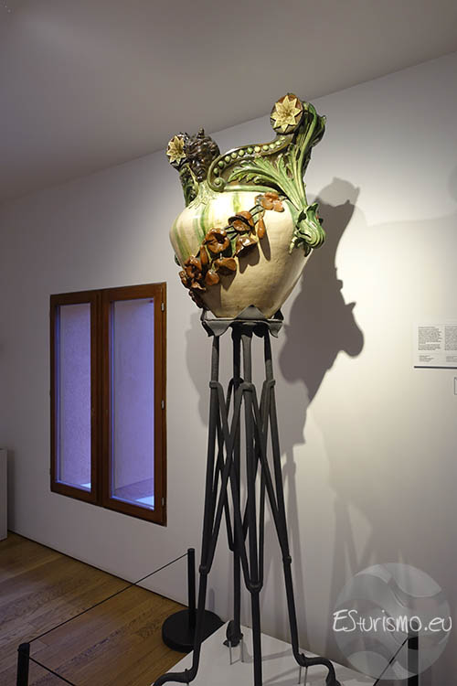 Aquella estufa, datada en el mismo año, presenta en los trabajos de marquetería las iniciales de Manuel Vicens integradas de manera discreta en el diseño. Gaudí concibió esta pieza a conjunto con aquel armario rinconero. Ambos muebles estaban originalmente rematados por pequeñas estatuillas de latón, que con el paso del tiempo fueron sustituidas por otros elementos decorativos. Al otro lado de la sala, se puede ver una jardinera diseñada por Gaudí en el último cuarto del siglo XIX, que pertenece a la misma Casa Vicens, concretamente se encontraba en el exterior del edificio, situada a la derecha de la escalera principal de acceso a la casa y adosada al muro perimetral. Es una pieza cerámica elevada sobre una base de hierro forjado, cuya decoración, inspirado en el mundo vegetal, consta de una guirnalda floral que recorre todo el contorno y la presencia de dos cabezas de fauno como elementos ornamentales.