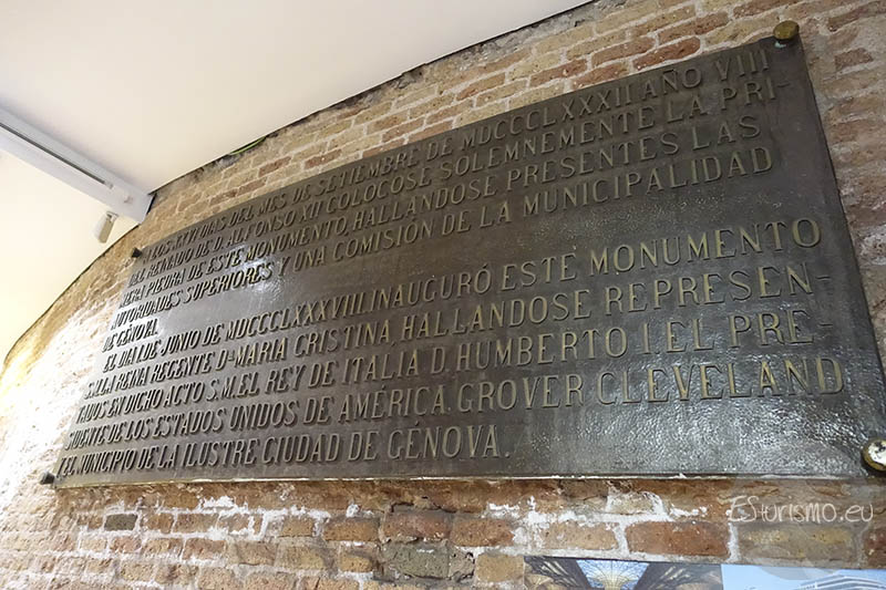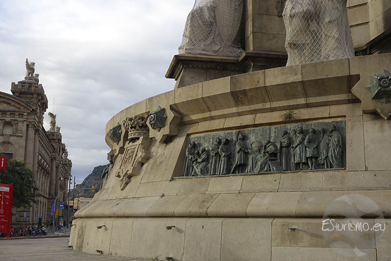 Desde aquí nace un amplio zócalo circular de 17 metros de diámetro que cuenta con ocho bajorrelieves de bronce que representan distintos momentos de la vida de Cristóbal Colón, alternados con ocho escudos tallados en piedra, cada uno vinculado a localidades españolas relacionadas con sus viajes. Las placas de bronce ilustran episodios de su trayectoria y de su travesía por mares desconocidos, destacando la imagen de un hombre decidido, que forja su camino por sí mismo. Uno de estos relieves muestra a Colón en el momento en que llega al monasterio de la Rábida (Huelva), solicitando alojamiento y alimento, subrayando así su humildad. Esta visión modesta del almirante fue reiterada por muchos de sus biógrafos, aunque la realidad era distinta: mientras circulaba la idea de que murió en extrema pobreza, su testamento reveló que poseía importantes bienes que legó a sus herederos, desmontando así el mito romántico de su indigencia.