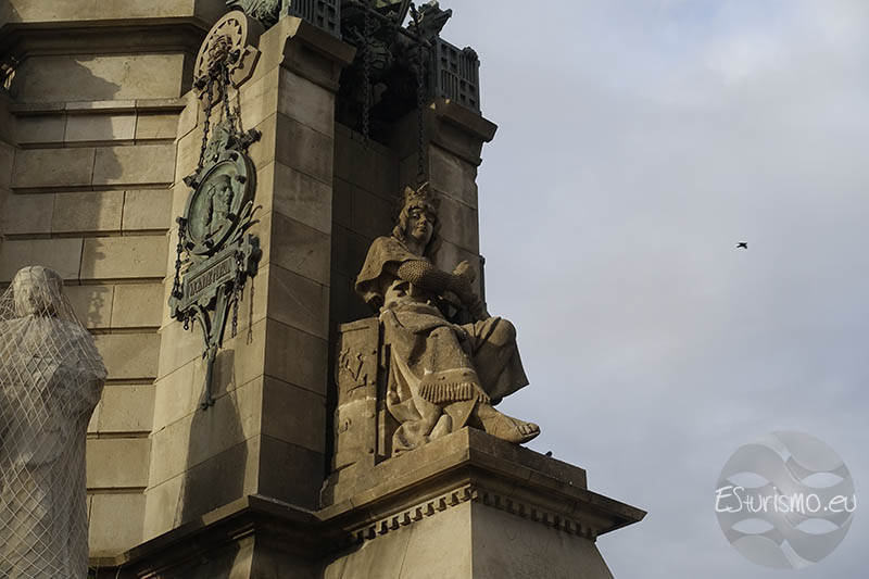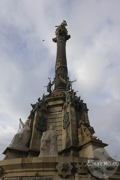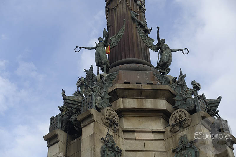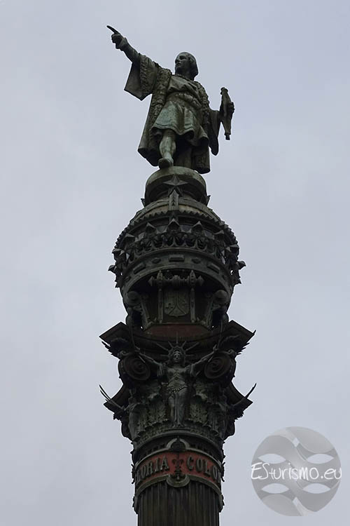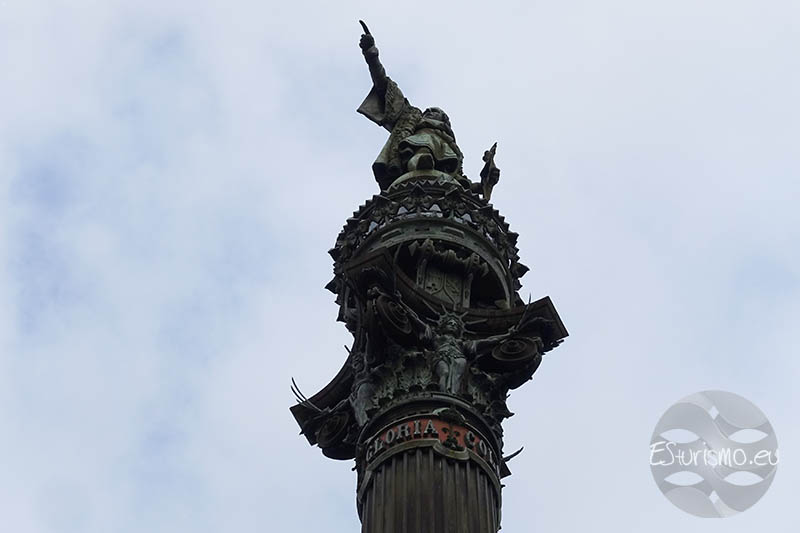 En la parte superior se encuentra la estatua de Cristóbal Colón, una escultura de bronce realizada por Rafael Atché que mide siete metros de altura, que descansa sobre un globo terrestre rodeado por una corona: la media esfera simboliza la porción del planeta que Colón abrió al conocimiento europeo, mientras que la corona que la circunda representa al Viejo Continente y la unión de ambos mundos que se inició tras 1492. La figura muestra al navegante sosteniendo en su mano izquierda una carta de navegación, mientras que mantiene el brazo derecho extendido y el dedo índice, el cual mide 50 centímetros, señalando hacia el mar, simbolizando el momento del descubrimiento de América. Como curiosidad, aunque muchas personas creen que la estatua apunta hacia el continente americano, en realidad lo hace en la dirección contraria, hacia el Mediterráneo, concretamente hacia la isla de Mallorca. Esto se decidió así porque se consideró más poético que la estatua mirara hacia el mar, en lugar de apuntar directamente al corazón de Barcelona.