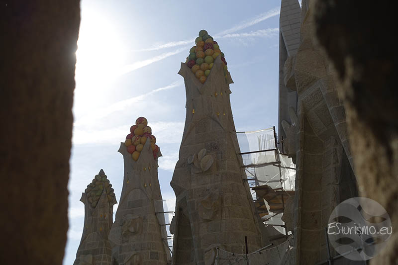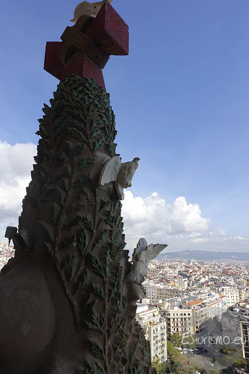 Desde aquí se aprecia los avances de la torre de Jesús, la más alta del templo con 172,5 metros (y que ha hecho que la Sagrada Familia sea la iglesia más alta del mundo). A ambos lados se alzan las torres dedicadas a Lucas y Juan con 135 metros cada una. De igual manera podemos ver de cerca los remates de los pináculos de la nave central que incorporan elementos vinculados a la Eucaristía, como racimos de uvas coronados por un cáliz y espigas de trigo rematadas con una hostia.
