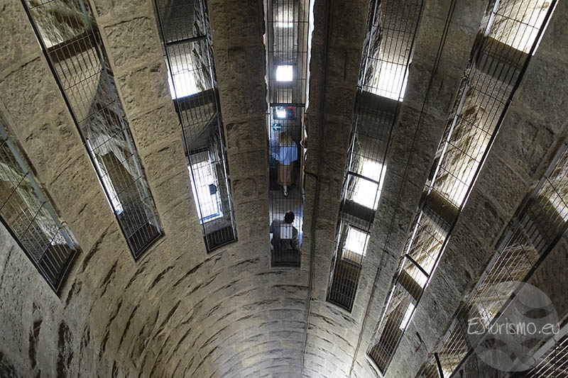 Tras atravesar el puente y llegar a la otra torre se comienza el descenso a pie a través de estrechos pasillos por un sistema de rampas y escaleras helicoidales sin eje central, con los peldaños apoyados en los muros que generan una sensación de movimiento continuo. En este recorrido, que podemos alternar con la torre dedicada a Bernabé, comprobamos que existen multitud de huecos en las paredes, concretamente aperturas verticales y diagonales que permiten la entrada constante de luz y aire. Quizás por eso, no se tiene, a pesar de la estrechez, una sensación de estar en un espacio opresivo ni, por supuesto oscuro, sino ligero y vertical, casi orgánico. Luz que entra por pequeñas aberturas es cambiante y va variando según la altura y la hora del día.