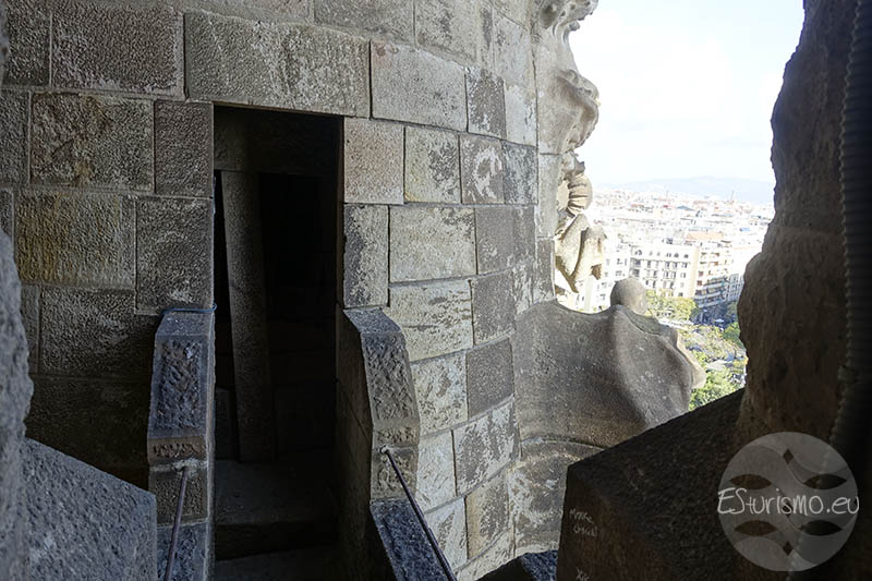 Incluso desde dentro de las torres comprobamos que aquí también la geometría es dinámica, gracias a sus curvaturas suaves. Cada cierto tiempo se abren pequeños balcones que se encuentran protegidos por barandillas que funcionan como puntos de transición entre el interior de la basílica y la propia Barcelona. Gaudí también tuvo en cuenta el sonido de estas torres, puesto que estaban destinadas a albergar las campanas y el canto litúrgico. Por eso se puede escuchar de manera bastante nítida el ruido de los pasos, de las voces o incluso del viento.