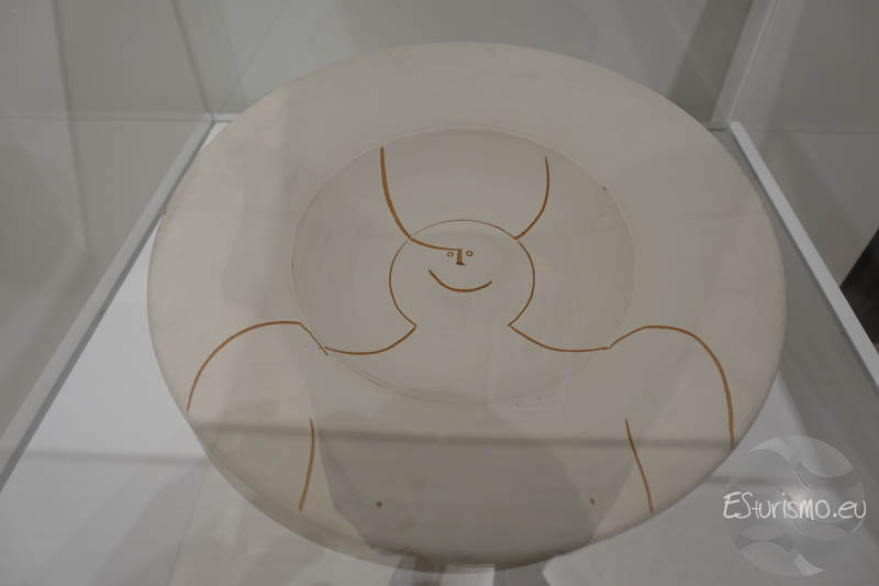 De esta manera el malagueño aprendió no sólo las técnicas tradicionales de la alfarería mediterránea, sino también las de decoración mediante engobes, óxidos y esgrafiados, además de la cocción con horno de leña de tipo romano. En una vitrina de esta sala vemos diferentes ejemplos, desde un jarrón que por su forma es llamado “Cabeza de mujer” (Vallauris, 1951), platos decorados con diferentes escenas, como toros, vasijas con naturalezas muertas, etc. Pero quizás la que más destaque de todas estas piezas es la llamada “Insecto”: se trata de una vasija (conocido en la Provenza como gus, y utilizado para guardar agua o vinagre) a la que Picasso le dio forma de un animal de seis patas: las asas por las que se pasaba una cuerda para colgarlo en la pared, aquí parecen las patas del insecto, mientras que la boca es la cabeza. Por tanto, estamos ante un buen ejemplo para entender la filosofía del artista de transformas objetos cotidianos en algo nuevo, piezas familiares que a la vez desprenden un aire enigmático. A pesar de ello, Picasso no utilizaba la técnica para crear ideas preexistentes, sino más bien, utilizaba la propia técnica para amplias sus límites, logrando efectos que otros artistas hubieran tachado de imposibles.