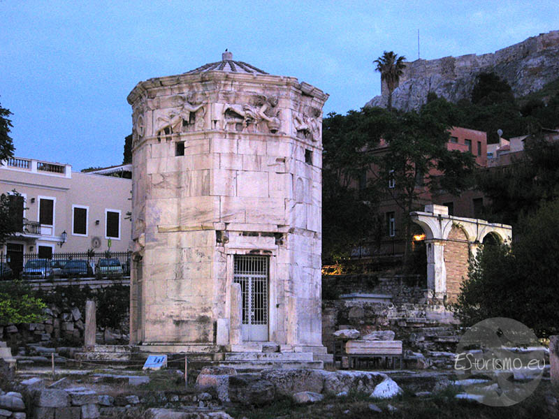 Pero quizás lo que más llama la atención es su parte superior donde vemos diferentes relieves que representan a los ocho Anemoi o dioses de los vientos. Se cree que en el techo hubo una vez una veleta de bronce con forma de Tritón, el dios el mar, que apuntaba a cada uno de sus ocho lados, según la dirección del viento: en el norte Bóreas, en el noreste Cecias, en el este Apeliotes, en el sureste Euro, en el sur Noto, en el suroeste Lipio, en el oeste Céfiro y en el noroeste Escirón.