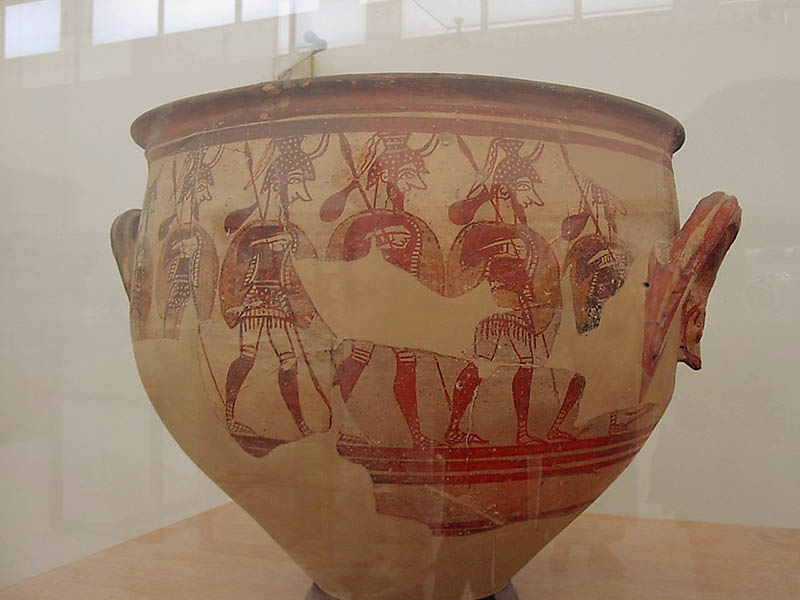 Finalmente, de la 28 a la 33 destacamos: objetos de la tumba III, un panteo minoico de oro (anillo-sello), un grupo de marfil que representan a dos mujeres con un niño del siglo XIII a.C., la crátera de los guerreros en la que se ven representados seis guerreros y una mujer, objetos procedentes de las tumbas de Váfio, cerca de Esparta, entre los que destacan las copas de oro con escenas de tauromaquia del siglo XV a.C., y objetos de bronce y oro procedentes de Dendra- Midea.
