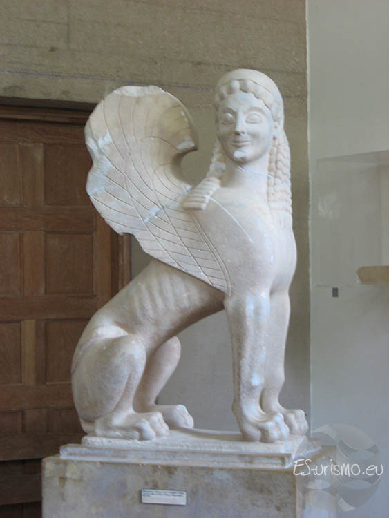 En esta parte del museo también destacamos una esfinge de mármol del 550 a.C. La escultura estaba colocada sobre la estela erigida en la tumba de un eminente corintio o ateniense situada en el cementerio norte de Corintio. Las esfinges eran bestias demoníacas con la cabeza de una mujer, las alas de un pájaro, el cuerpo de un león y la cola de una serpiente; encarnaban poderes sobrenaturales que asustarían a las personas del período arcaico. Por ello fueron utilizadas como mecanismo de defensa sobrenatural y para desalentar a los posibles ladrones de tumbas.