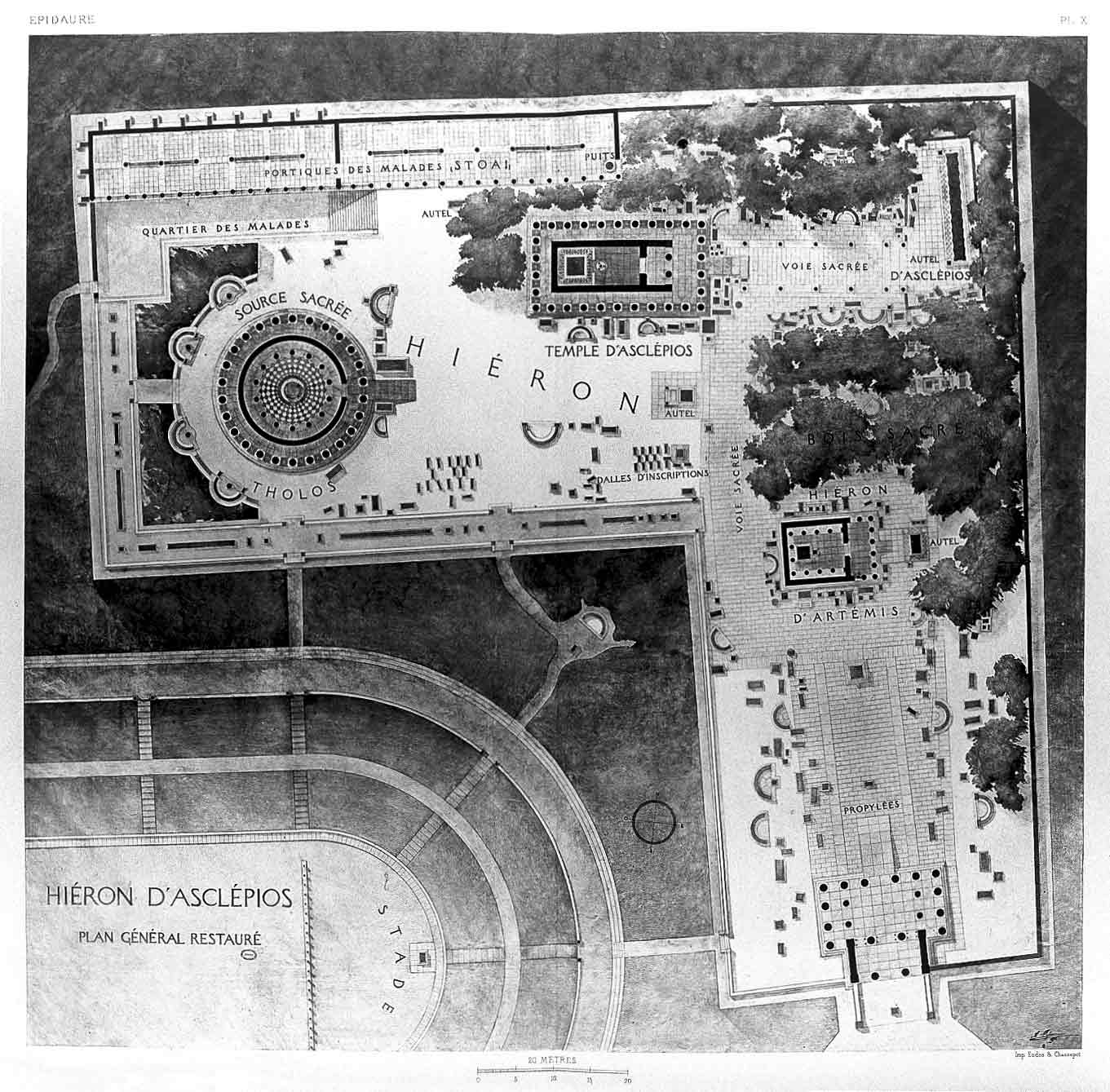 Las ruinas de Epidauro estaban dedicadas al culto de Asclepio, dios de la medicina, y el lugar se convirtió en el mayor centro terapéutico de la antigüedad, contando con un centro de enseñanza de la medicina donde aprendían los sucesores de Asclepio. En el recinto tenía lugar cada cuatro años las "Asclepeia" que combinaban la gimnasia y la música.