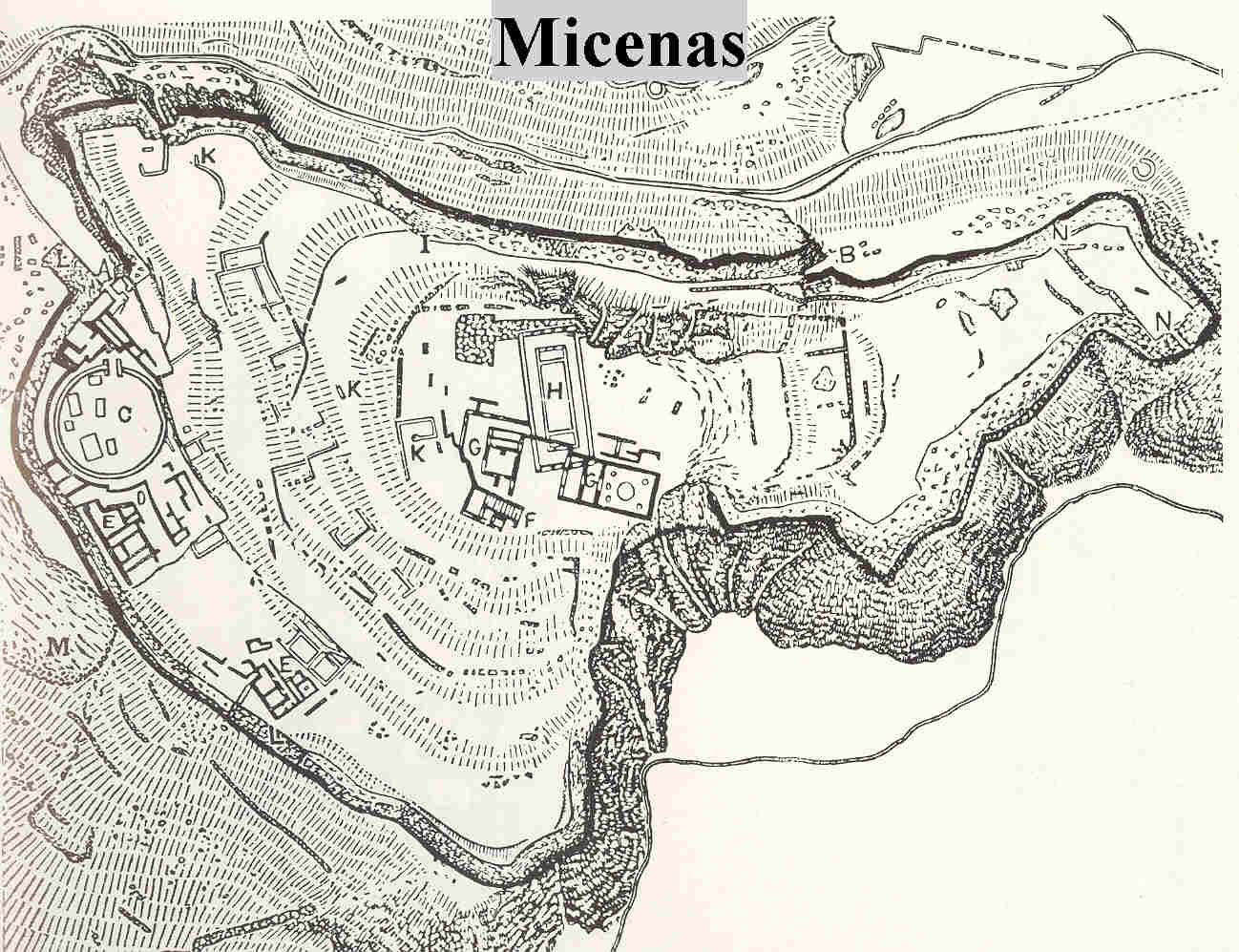 La acrópolis o ciudad alta de Micenas se debió de fortificar hacia el 1500 a.C. y alrededor del 1350 a.C. se rodeó la colina con las murallas ciclópeas y posteriormente monumentales palacios. Su riqueza aumentó llegando a llamarla Homero "rica en oro". Además, su rey Agamenón encabezó la guerra contra Troya. El poder de Micenas declinó hacia el 1200 a.C. cuando se produjo la invasión dórica en el siglo XII a.C., y a partir de entonces cayó en el olvido, con lo que Micenas ya en el siglo II a.C. estaba en ruinas.