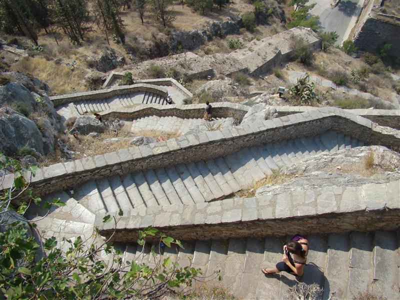 Para acceder a la fortaleza podemos ascender a través de una escalera en zig zag de ochocientos cincuenta y siete escalones que la une con Platía Nikitará y que sólo recomendamos para los muy deportistas. Otra forma de llegar es en coche a través de una carretera de 3 kilómetros, opción que elegimos nosotros..