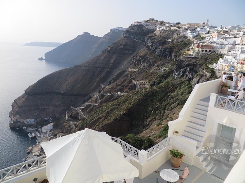 Como decimos, aquí podemos encontrar algunos mirados desde los que se obtienen unas buenas vistas del Egeo y la caldera. Y es que la ciudad está situada sobre un acantilado sobre la caldera, a 260 metros del nivel de mar, en la zona oeste de la isla. La belleza de Fira queda enseguida evidenciada cuando se recorre sus calles o, mejor aún, cuando se llega por barco a la isla y se ve por primera vez. Es una sensación increíble.