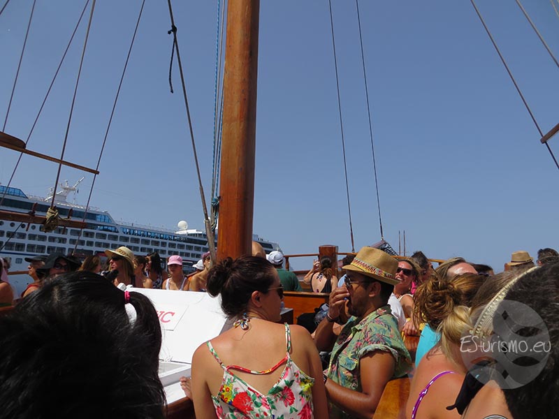 Después de unos 10 o 15 minutos, tocaron la campana desde el barco para regresar. La verdad es que nadar del calor al frío se pasa un poco mal, pero merece la pena. La excursión a las islas Kameni ha finalizado, pero todavía nos queda el viaje de regreso al puerto antiguo de Fira. Minutos ideales para admirar por última vez el fascinante volcán y para volver a observar la media luna con la blanca Fira en lo alto del acantilado.