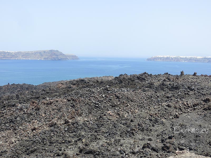 Lo que estamos pisando en este momento es lava solidificada de la erupción de 1570-1573, llamada Mikrí Kameni, la parte más vieja de Nea Kameni. Si nos fijamos bien podemos ver tonos de negros en contraste con partes donde se extendieron la lava de la erupción de 1925-1925, a un lado y a otro de Mikrí Kameni. Por aquél entonces una serie de temblores sísmicos avisaban a los habitantes de Santorini de que el volcán estaba despertando.