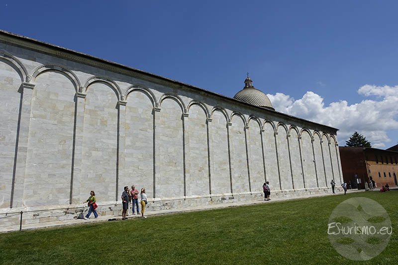 El revestimiento de mármol blanco del muro hace que encaje con armonía en el conjunto monumental y su decoración, a base de 43 arcos ciegos, retomaba las formas románicas empleadas en la catedral siglos antes, en lugar de seguir la moda gótica de la época. En los arranques de los arcos se aprecian pequeñas testine (cabecitas escultóricas) que animan el relieve del muro. El ritmo constructivo en el resto del edificio, sobre todo en las zonas norte y occidental, fue más lento y solo culminó a finales del siglo XIV. Las dificultades económicas y políticas tras la peste negra influyeron en esta ralentización: un ejemplo claro es el muro norte, donde se proyectaron catorce capillas privadas, pero apenas dos llegaron a levantarse por la falta de mecenas. La gran cubierta de plomo que se terminó a fines de ese siglo marcó prácticamente el cierre del proyecto, poco antes de que Pisa perdiera su independencia frente a Florencia.