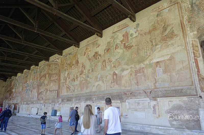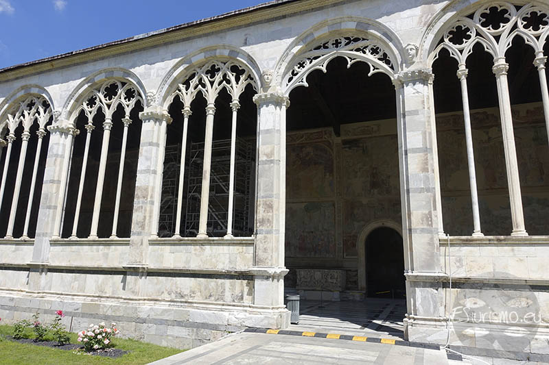 A partir de la década de 1320, las obras del Camposanto avanzaron sin interrupción: se empezó por la esquina sureste y, en los primeros años de la década de 1330, ya estaban bastante adelantadas las galerías oriental y meridional, espacio en el que artistas como Francesco Traini y Buonamico Buffalmacco realizaron sus grandes ciclos de frescos. Hacia 1340 la galería sur estaba concluida y se trabajaba ya en el pasillo occidental. En ese mismo periodo se completó la fachada que mira hacia la plaza, que la enmarca desde este lado, y que fue diseñada con dos portales en correspondencia con los accesos del baptisterio y de la catedral. Esta última puerta cuenta con un tabernáculo gótico con la Virgen con Niño y santos, obra atribuida a un seguidor de Giovanni Pisano, y detalles escultóricos (ángeles) asociados a Tino di Camaino.