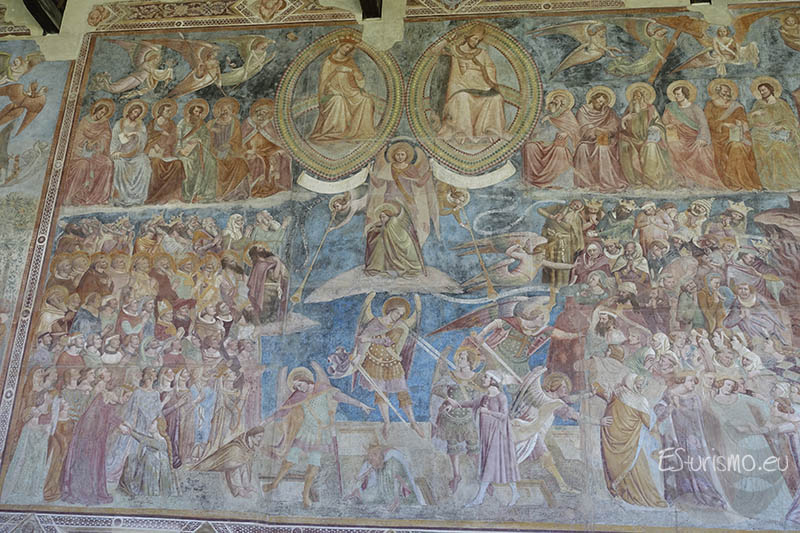 Otro fresco de Buffalmacco se encuentra a continuación, el titulado El Juicio Final y el Infierno, el cual también fue recientemente restaurado. La pintura presenta características que se distingue de las composiciones tradicionales de Giotto ya que, mientras que el pintor florentino solía reunir en una misma escena el juicio de las almas y su posterior condena, Buffalmacco prefirió tratarlos como episodios separados, aunque manteniendo una iconografía cercana al estilo de Giotto. En la parte superior de la pintura se encuentra la Jerusalén celestial, rodeada de ángeles y bienaventurados que dirigen su mirada hacia Cristo. Con su gesto, el Redentor divide el espacio en dos ámbitos: a un lado los elegidos, al otro los condenados arrastrados por un río de fuego hacia el Infierno, mientras que un grupo de ángeles armados con espadas los conduce hacia los tormentos infernales.