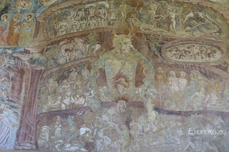 Por su parte, el infierno pintado por Buffalmacco aparece estructurado con un orden descendente. En el centro domina la figura de Lucifer, que devora a las almas con tres bocas, siguiendo la tradición iconográfica. Esta visión recuerda los tormentos descritos por Dante en la Divina Comedia. La paleógrafa Giulia Ammannati, profesora de la Scuola Normale de Pisa, plantea una hipótesis sugestiva: entre los castigados podrían estar representados Dante y Virgilio. Según ella, los promotores de la pintura, los dominicos del convento de Santa Caterina junto con el arzobispo de Pisa, habrían querido condenar simbólicamente al Poeta Supremo por sus ideas y escritos.