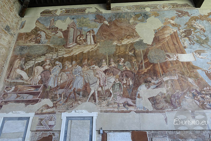 El extremo de la pared sur está ocupado por el célebre fresco “El Triunfo de la Muerte”, también obra de Buonamico Buffalmacco que la realizó entre 1336 y 1341. Con unas dimensiones imponentes (15 metros de ancho por más de 5 de alto) se considera una de las composiciones más sobrecogedoras del ciclo que el artista ejecutó en este lugar. Lamentablemente, la obra también sufrió graves daños durante la Segunda Guerra Mundial, aunque tras un largo proceso de restauración pudo ser devuelta a la contemplación pública en 2018. El fresco encarna de manera magistral el espíritu medieval del “memento mori”, recordando la fragilidad de la vida y la inevitabilidad de la muerte. Su desarrollo narrativo comienza en la parte superior izquierda, donde un grupo de nobles, durante su paseo a caballo, se encuentran cadáveres en diferentes etapas de descomposición, mientras un ermitaño observa y recuerda la fugacidad de la existencia. En contraste, a la derecha aparece un jardín idílico donde otros aristócratas disfrutan de placeres mundanos, ajenos al destino que les espera.