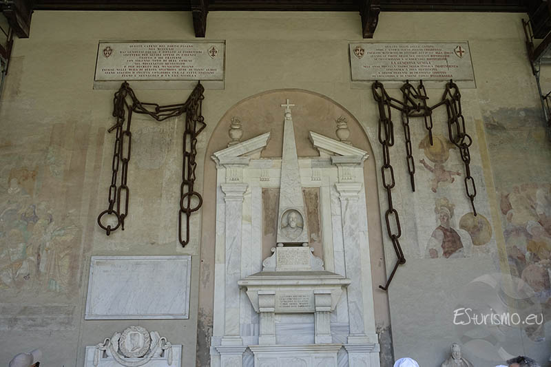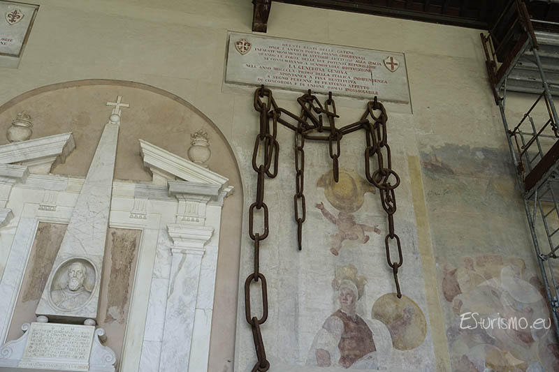 Después de la derrota sufrida por Pisa en la batalla de Meloria (1284), las cadenas fueron trasladadas a Génova, donde se colocaron en distintos puntos de la ciudad como símbolo de burla hacia los pisanos vencidos y como demostración de su supremacía. Un siglo más tarde, algunas de esas cadenas fueron tomadas por los florentinos, quienes las expusieron en las columnas del Baptisterio. Con la Unificación de Italia en 1861, y en un ambiente de reconciliación nacional, las cadenas fueron restituidas a Pisa como gesto de paz, las cuales en la actualidad la mayoría de ellas se encuentran en este Camposanto monumental.