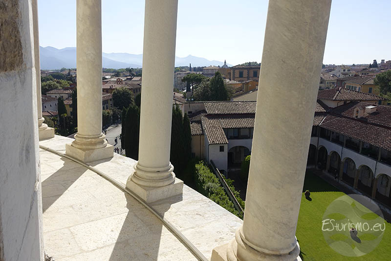 La primera vez que salimos al exterior fue en la sexta planta de la torre, donde comprobamos una vez más la evidente inclinación del monumento, a pesar de lo cual hay una vista de 360º de Pisa, la plaza de los Milagros, y todo el entorno. Lo primero que nos viene a la mente al desembocar en esta galería es el evidente peligro que antaño corrían las personas, puesto que antes el espacio resultante entre las columnas de la arcada no tenía ningún tipo de valla, como sí ocurre ahora. Recorriendo este anillo podemos ver más de cerca las columnas y sobre todo los capiteles, en algunos de los cuales se representaron caras, unas con una expresión más amable que otras.