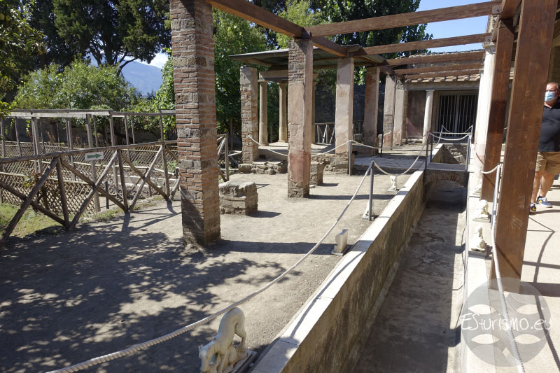 Excavado por primera vez en 1916 y posteriormente en 1933 y 1971, este complejo que se construyó alrededor del siglo II a.C. es un ejemplo a pequeña escala de lo que eran las grandes villas situadas en el campo. La entrada principal estaba flaqueada por dos tiendas, originalmente eran dos habitaciones de la propiedad. Aquí vemos varios moldes: en una de las tiendas a una víctima de la erupción, y los de las puertas de acceso al complejo.